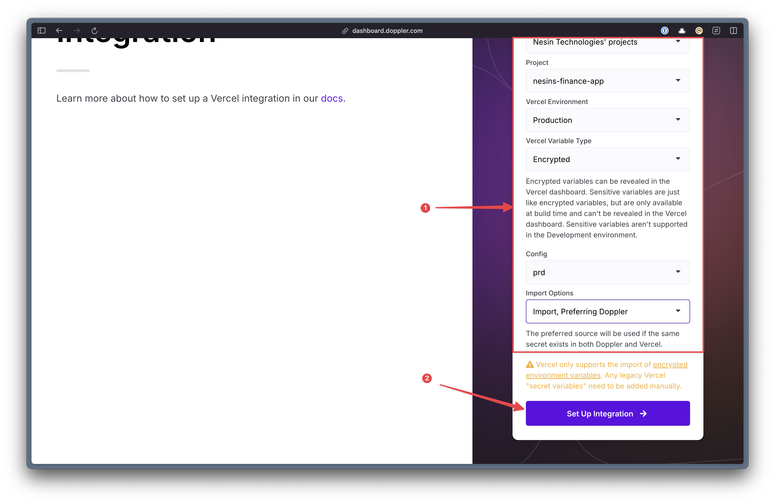 Once the app is connected, you need to configure your preference like which project, env, import options, etc.